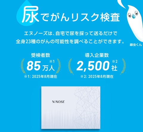 N-NOSEは、ステージ0~1の早期がんにも反応する「線虫がん検査」。尿を採取して送るだけで、膵臓がんを含む、23種類のがんリスクを全身網羅的に調べられます。