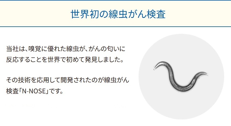 N-NOSEは、尿に含まれるがん特有の匂いを線虫(微小生物)が検知する検査で、ステージ0~1の早期がんにも反応。